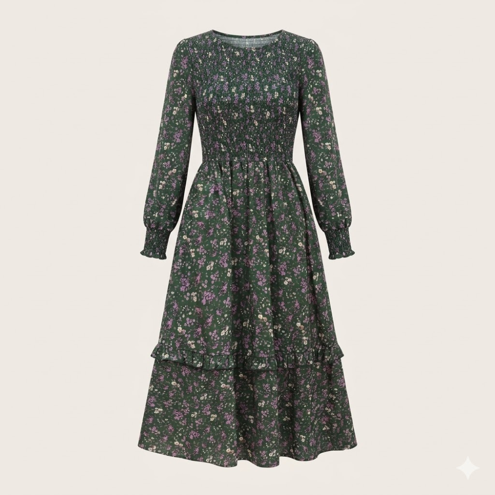 Mix softness with edge by pairing a dark floral midi dress with a fitted leather jacket. This combination blends romantic goth influences with everyday wearability.
