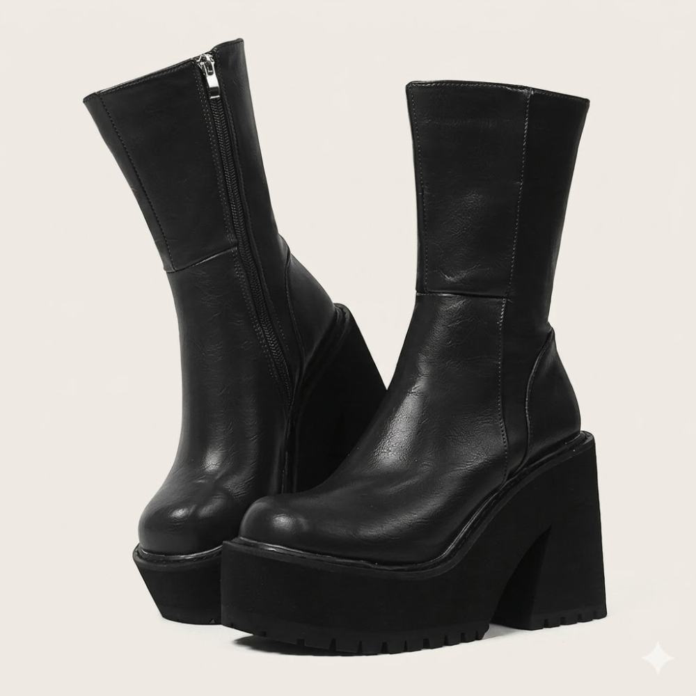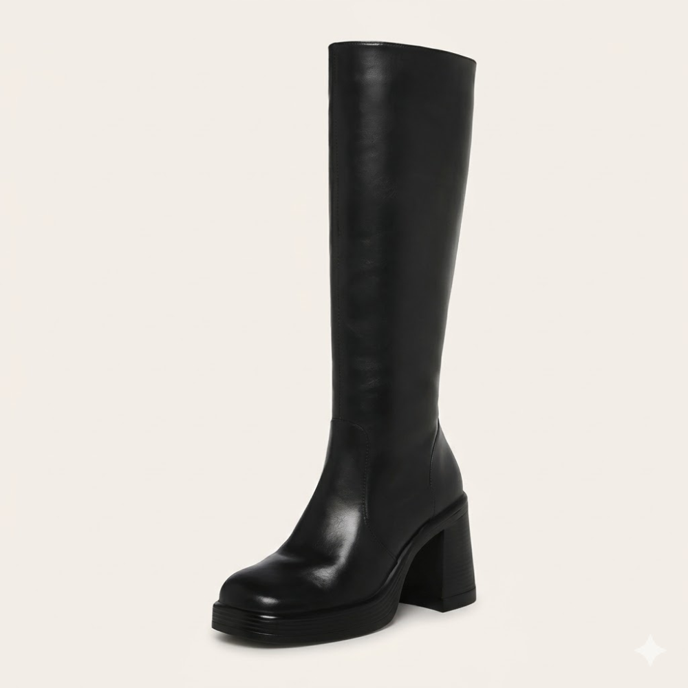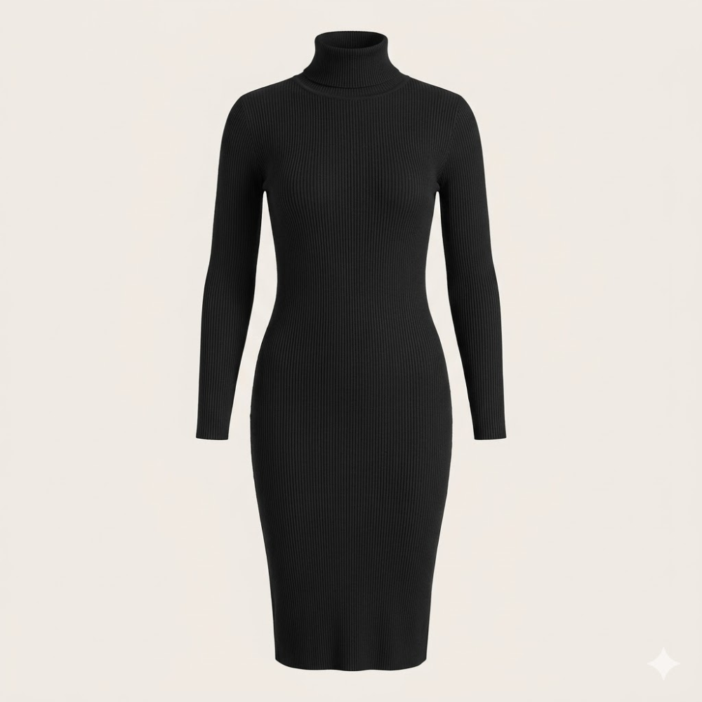 A fitted black sweater dress styled with bold knee-high or platform boots creates a powerful winter silhouette. Add a belt to enhance shape and structure.
